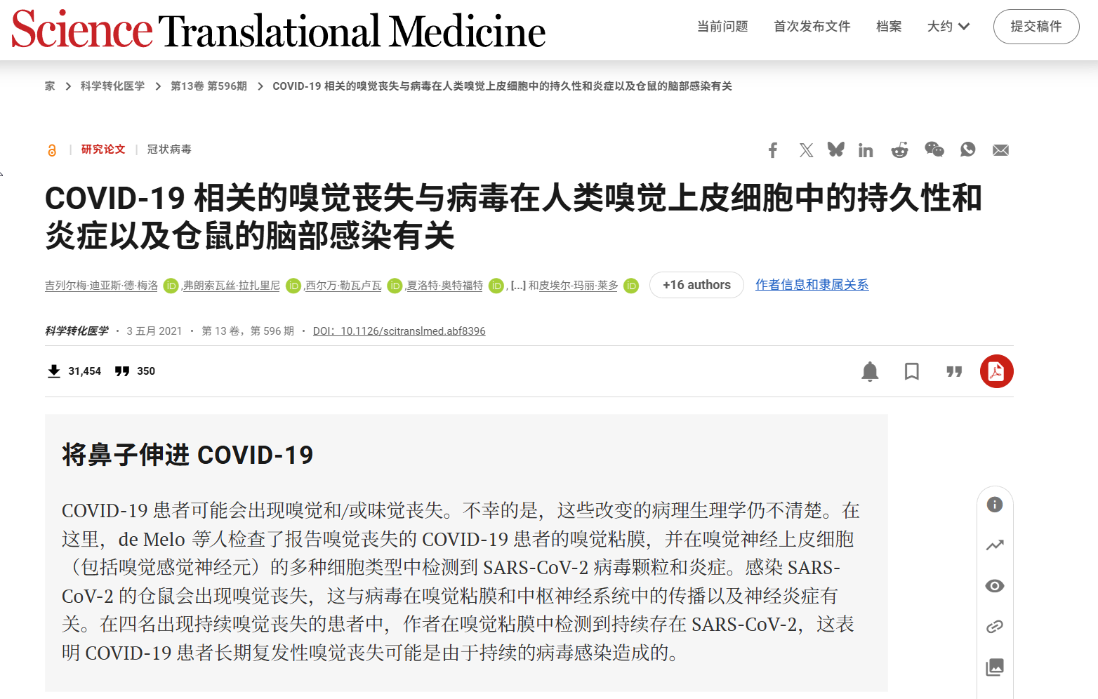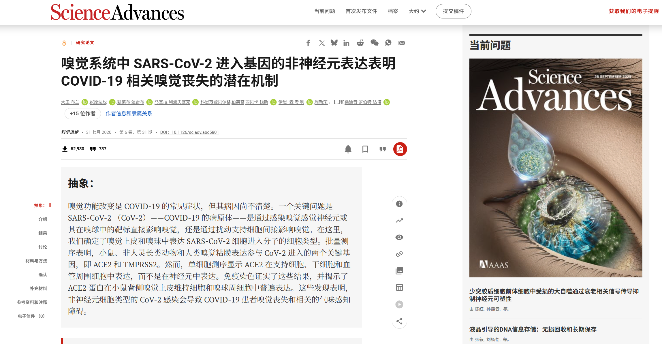 要回答这个问题,得从科学角度切入。老T在 Science 上查到一项研究显示,新冠病毒对嗅觉系统的冲击远超普通感冒。它不像感冒那样主要是鼻塞堵路,而是直接“入侵”嗅觉上皮,也就是鼻子里的那些负责闻味儿的细胞。病毒通过 ACE2 受体进入支持细胞(sustentacular cells),导致炎症风暴,进而影响嗅觉神经元。这不是一次性的损伤,而是可能留下“后遗症”:慢性炎症或神经修复不全,让嗅觉系统变得脆弱。