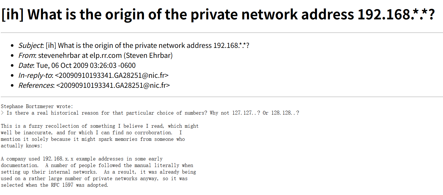 老T又翻了点历史资料,找到的是美国知乎上关于 RFC 1918 的讨论。才发现,原来 192.168 这串数字不是随便挑的,而是 IANA(互联网数字分配机构)在1990年代分配时的一个“随手”选择: